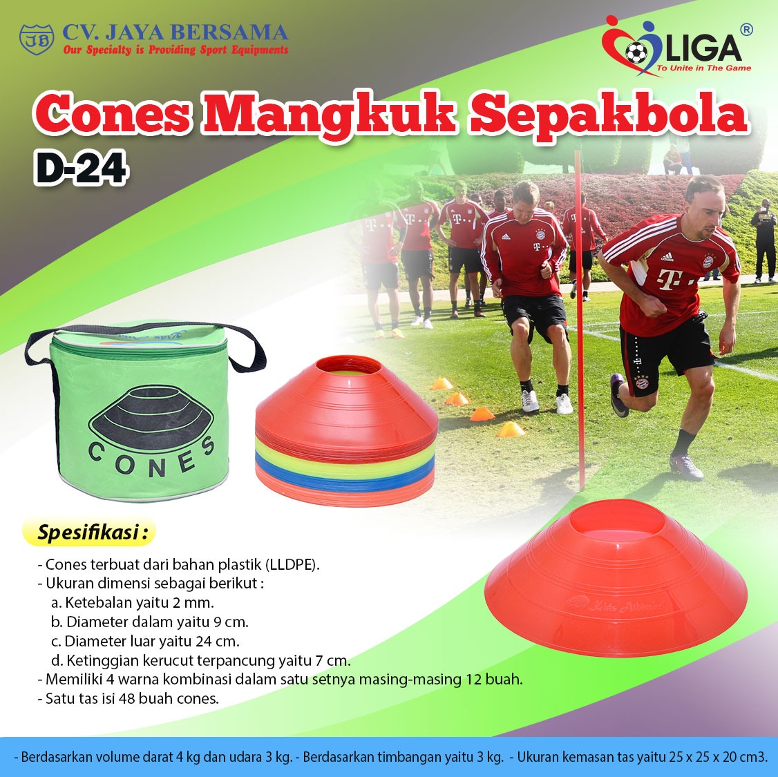 Spesifikasi Cones Mangkok Sepakbola D-24 merek Liga sebagai berikut :
