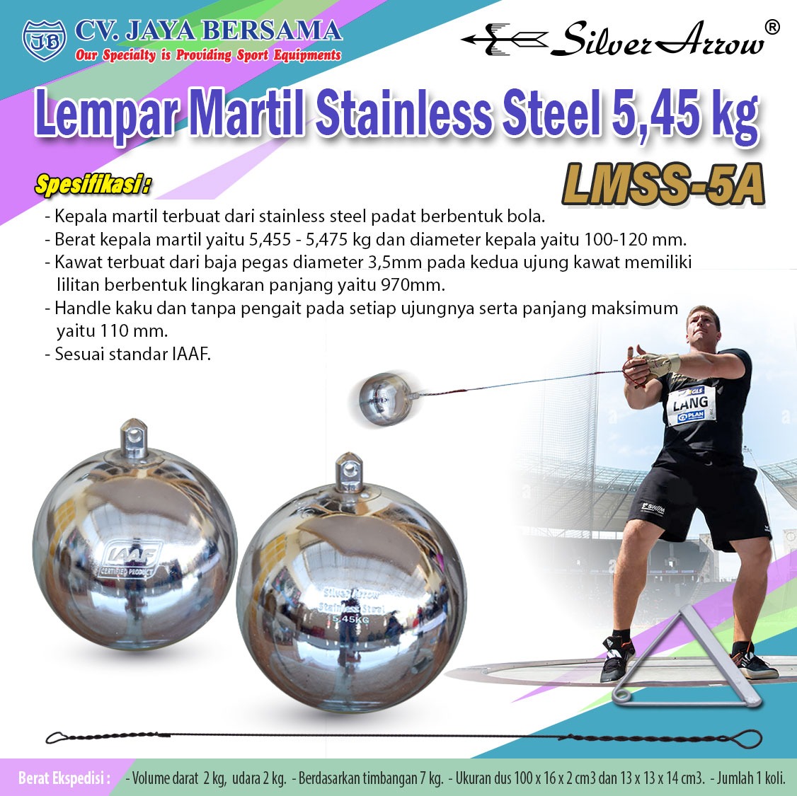 Spesifikasi Lempar Martil Stainless Steel 5.45kg LMSS-5A merek Silver Arrow sebagai berikut :