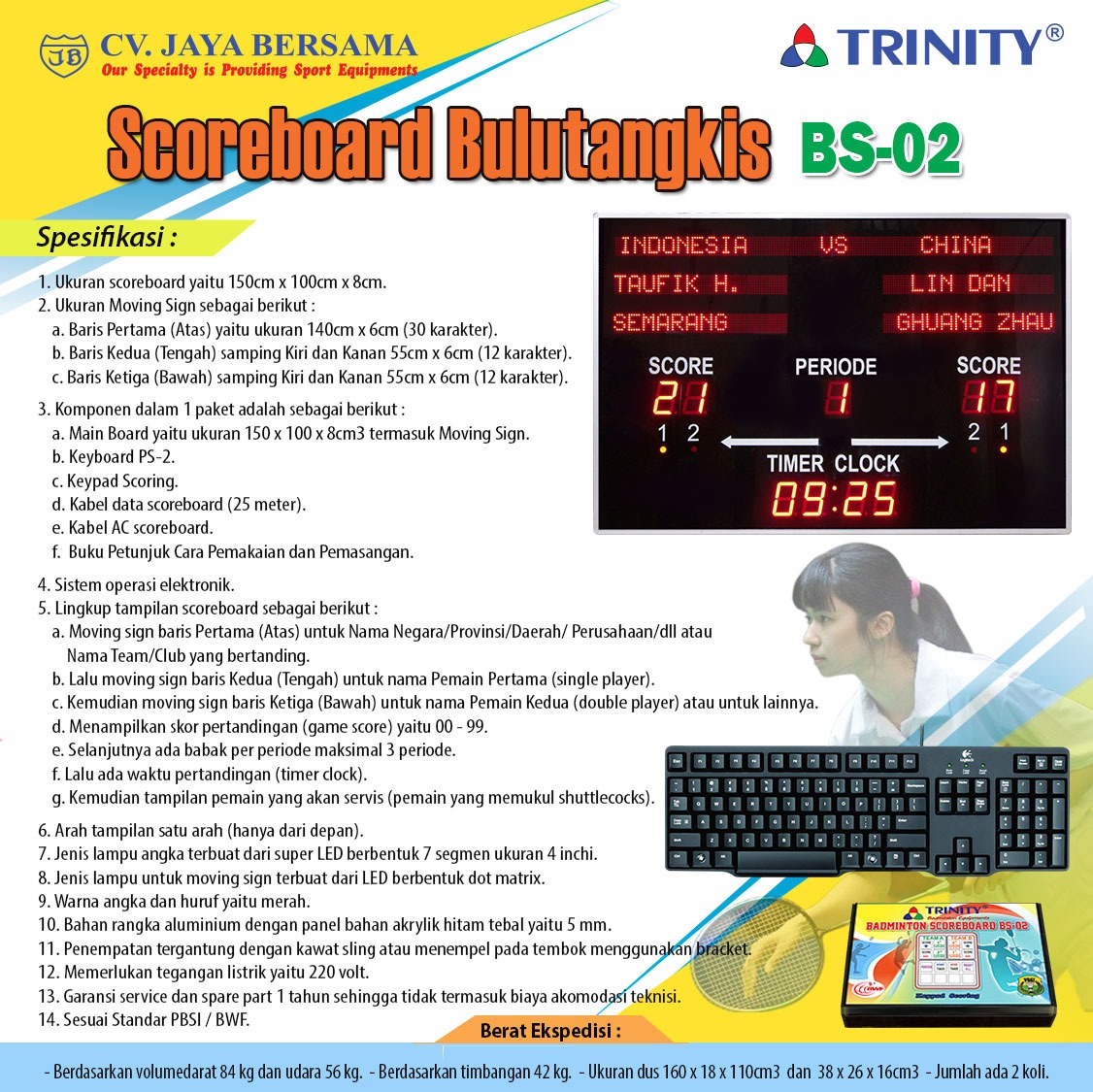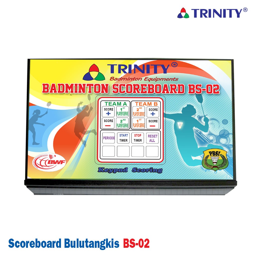 Spesifikasi Papan Skor Bulutangkis BS-02 merek Trinity adalah sebagai berikut :