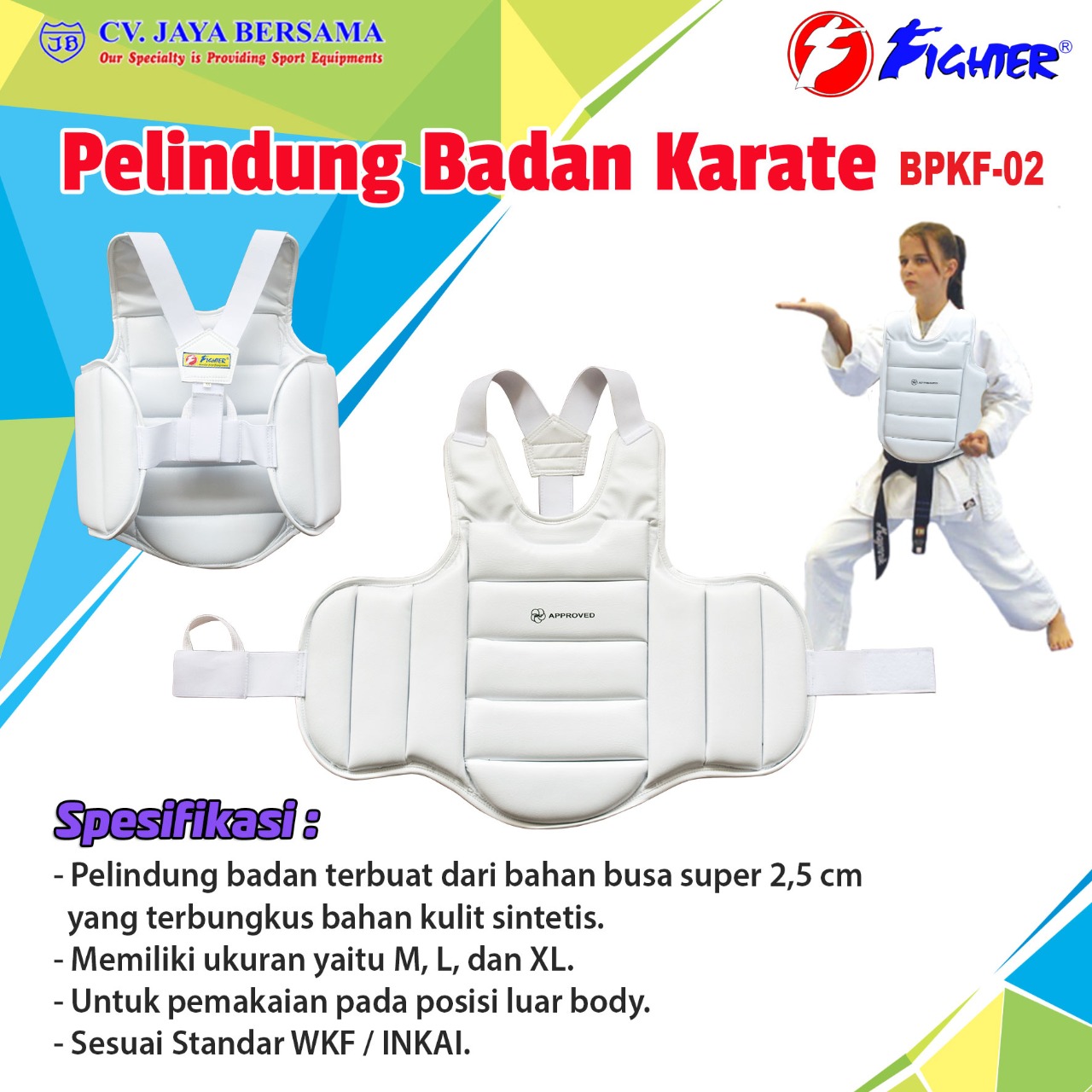 Spesifikasi Pelindung Badan Karate BPKF-2 (Full) merek Fighter sebagai berikut :