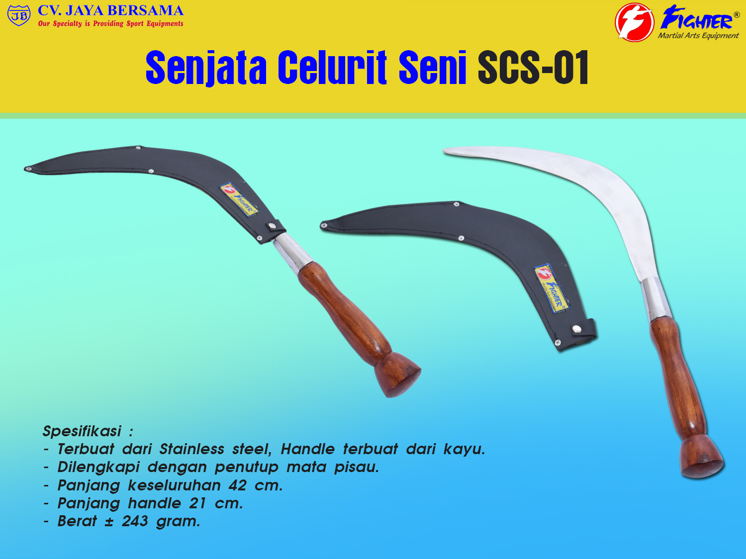 Spesifikasi Senjata Celurit Seni Silat SCS-01 merek Fighter sebagai berikut :